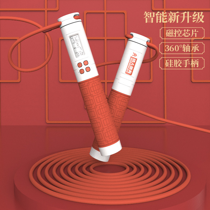 > 铁人体育跳绳健身减肥运动大人成人钢丝电子计数专业绳中国红礼品