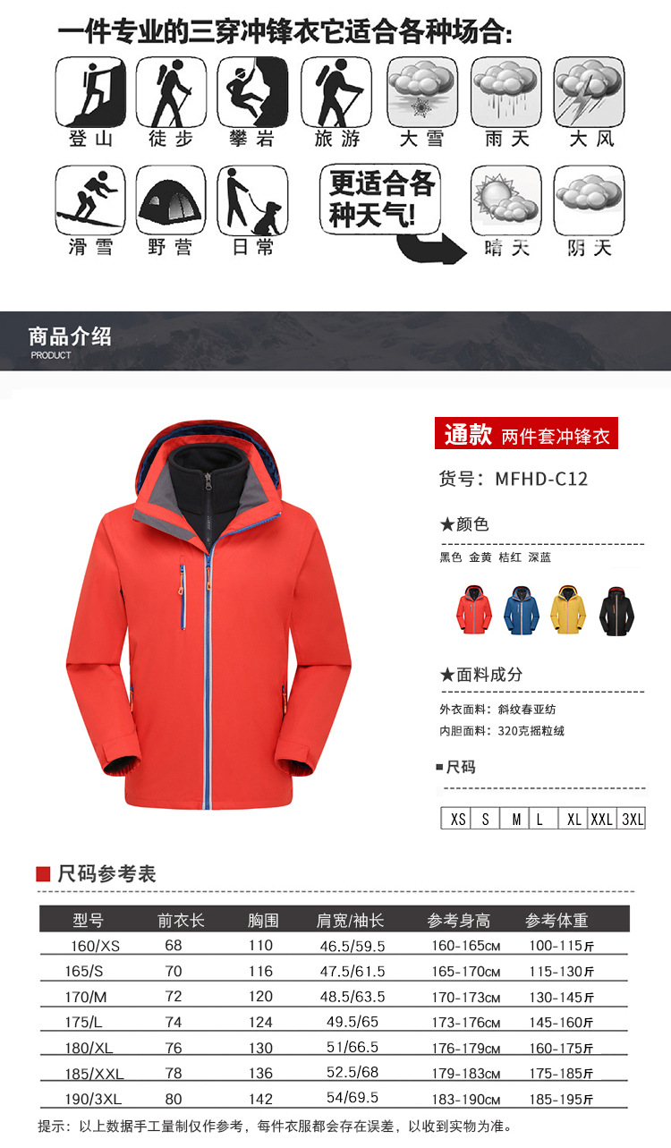 户外运动三合一两件套男女款冲锋衣防水防风登山服批发团购定制