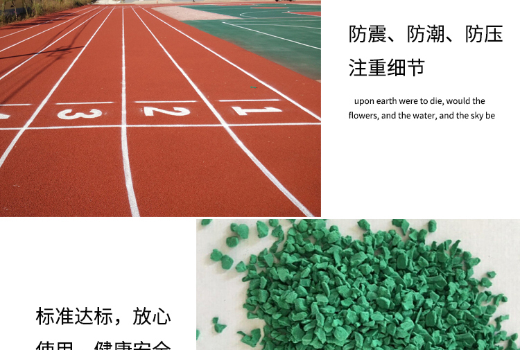 商品名称:塑胶跑道材料地胶篮球场硅PU学校操场幼儿园EPDM彩色橡胶颗粒施工