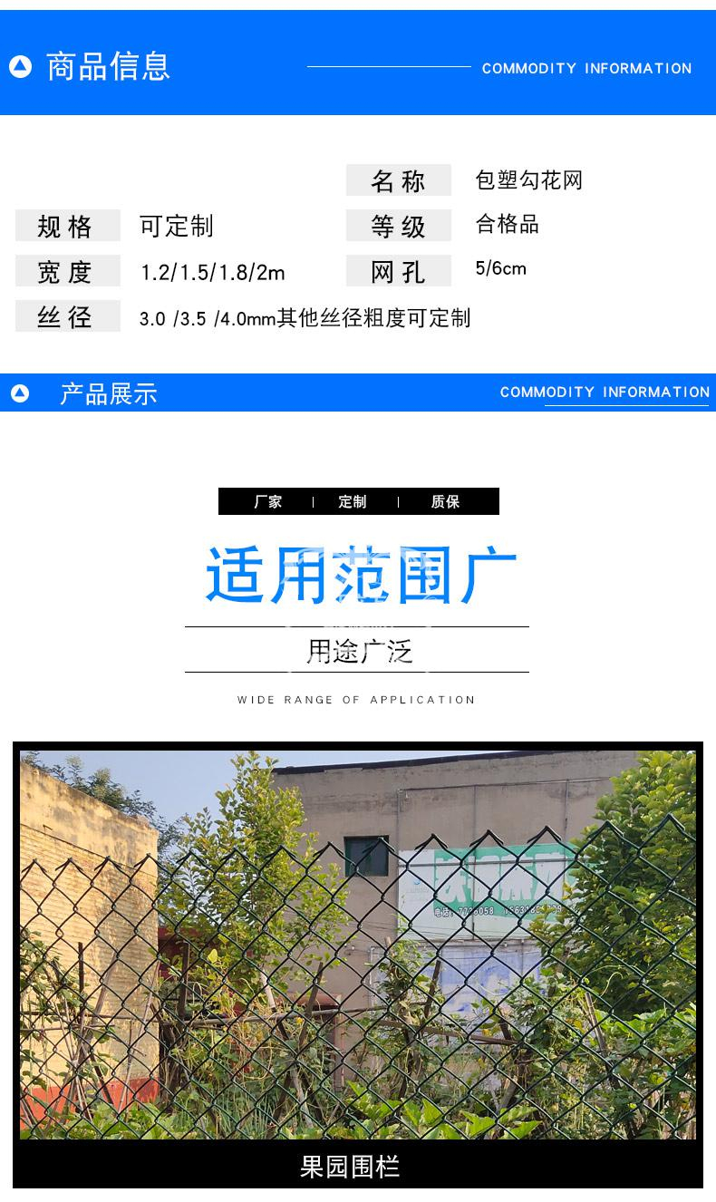 商品名称:养殖护栏网球场护拦隔离网包塑勾花网铁丝围网圈地果园鱼塘防护网 1.8米高6公分孔20米长3.6mm粗